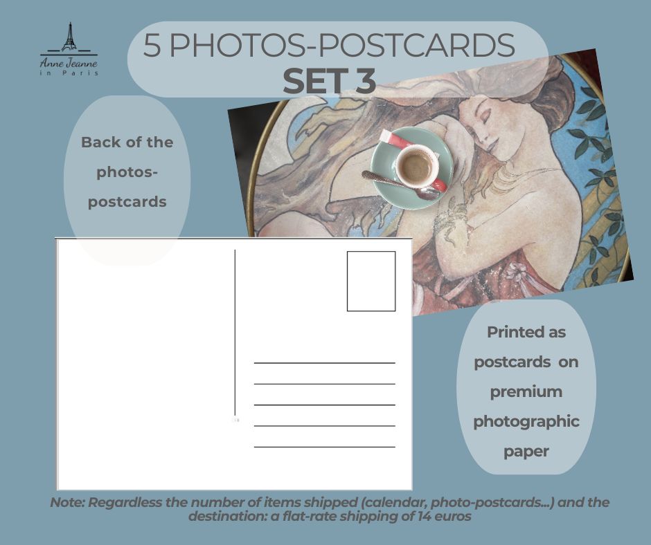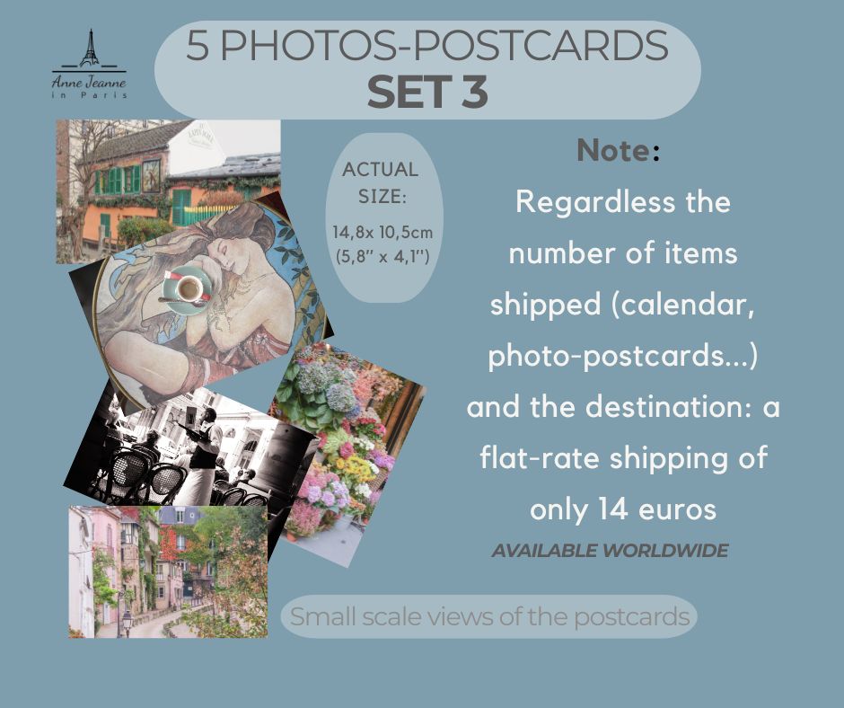 Flat cost shipping: 14€ Regardless the number of items shipped (calendar, photo-postcards…) and the destination: a flat-rate shipping of 14 euros ( =15 $ or 23.2 AU$ or = 11.2 £).